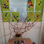 We hebben elke dag naar de lentebloemen gekeken. We hebben gezien dat de narcissen bijna zijn uitgebloeid. De hyacinten ruiken nog steeds lekker. Vrijdag hebben we ze zelf geknutseld met een groene stengel en propjes van crèpepapier. Op het blauwe blad hebben we laten zien hoe de hyacint groeit.