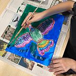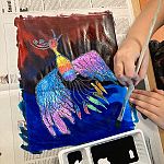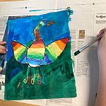 De leerlingen van de groepen 6 en 7 hebben fabelachtige vogels gemaakt. Ze hebben eerst een tekening gemaakt met wasco en daarna met ecoline geverfd.