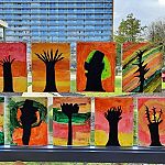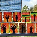Vorige week hebben de leerlingen de achtergrond gemaakt. Gisteren, om 09.10 uur, zijn we begonnen met het afmaken van de opdracht. Ze moesten een boom schetsen en uitknippen. Nog best lastig! Maar wat was het leuk om de dag te beginnen met een handvaardigheidsopsdracht!