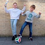 Tess en David uit groep 6a showen de bekers die gisteren zijn behaald tijdens de finales van het schoolvoetbaltoernooi.De meiden behaalden de derde prijs, de jongens werden vierde!Gefeliciteerd! 🏆