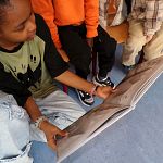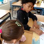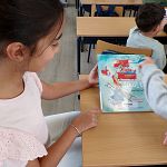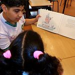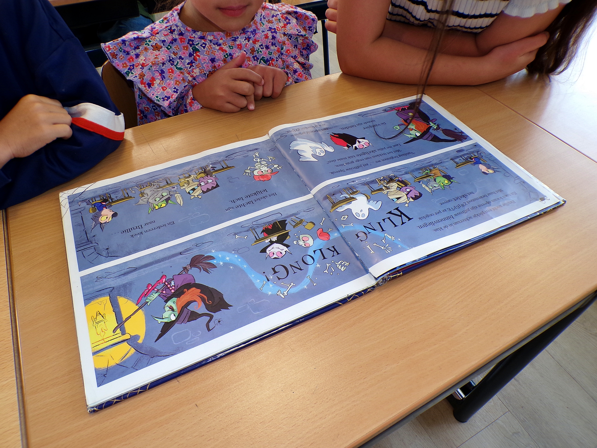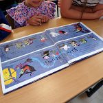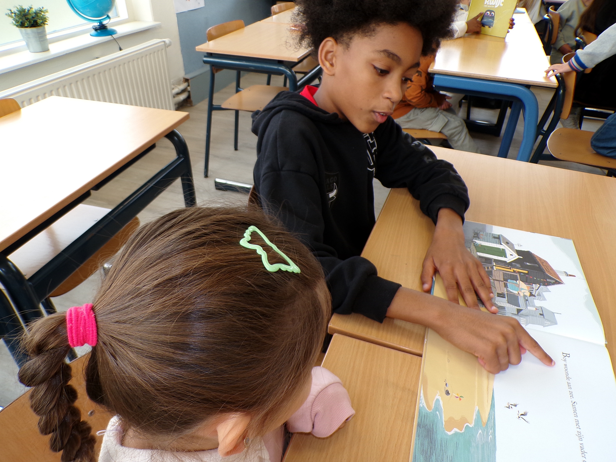 De leerlingen van groep 8a lezen prentenboeken voor aan de kinderen van de groepen 3 in het kader van de Kinderboekenweek 2025.
